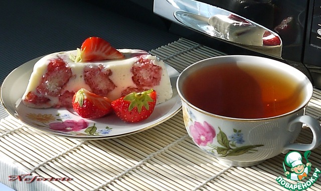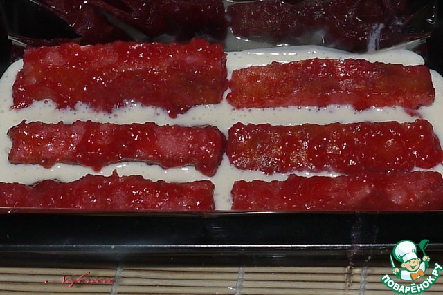 Налить на дно формы немного сырного крема, полоски окунать в клубничный джем и разложить по форме, полить опять сырным кремом, положить пропитанные в джеме полоски и вылить оставшийся крем.