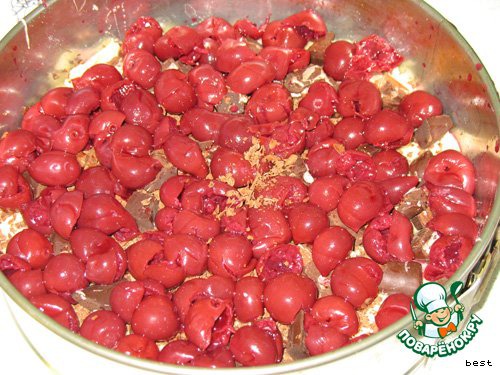 Тесто выложить в разъемную форму диаметром 20 см и разровнять руками. Измельченный шоколад равномерно посыпать на тесто, поверх этого слоя выложить вишню.