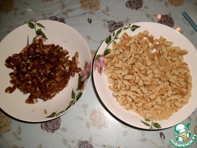 Очистить от шкурки финики, удалить косточки, измельчить. Раскрошить печенье.