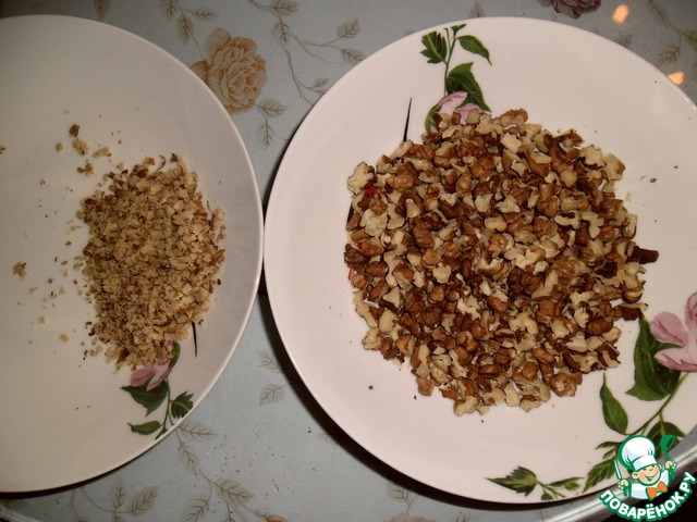 Ядра грецких орехов порубить. На фото в одной тарелке молотые, а в другой- порубленные орехи.