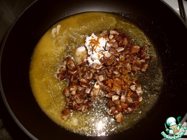 В тефлоновой сковороде перемешать сливочное масло, сахарную пудру, цедру, финики, по желанию можно добавить 1/2 ч. л. корицы. Варить на среднем огне до размягчения фиников в густую массу, примерно 5 минут.