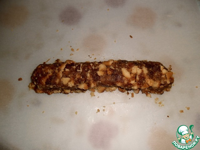 Перемешать в чашке рубленые и молотые орехи, печенье, финики с маслом. Сформировать "колбасу".