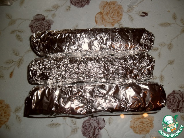 Завернуть ее в фольгу, немного утрамбовать. У меня получилось 3 вот такие колбаски. Охлаждать в холодильнике 3-4 часа. Две колбаски я нарезала на блюдо, а одну завернула в подарочную упаковку.