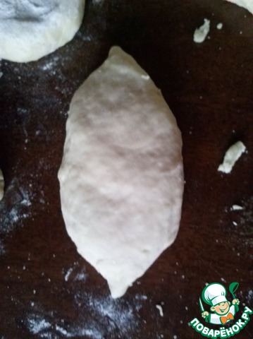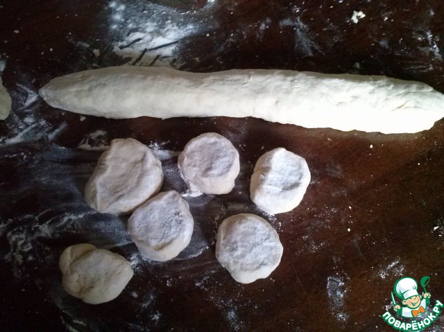Тесто разделить на две части и скатать из них сосисочки:) Каждую сосиску разделить на 6 частей и раскатать их в кружочки (обмакнув в муку с 2-х сторон)