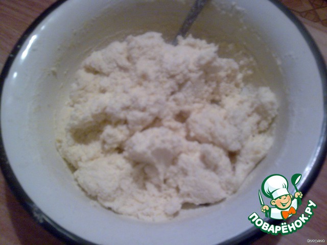 Замесить тесто из творога, сметаны, сахара, соды, соли и муки.