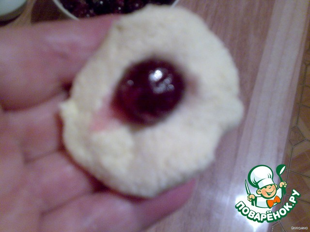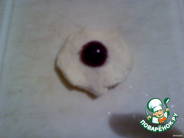 Из кусочка теста скатать шарик, расплющить его и положить вишню.