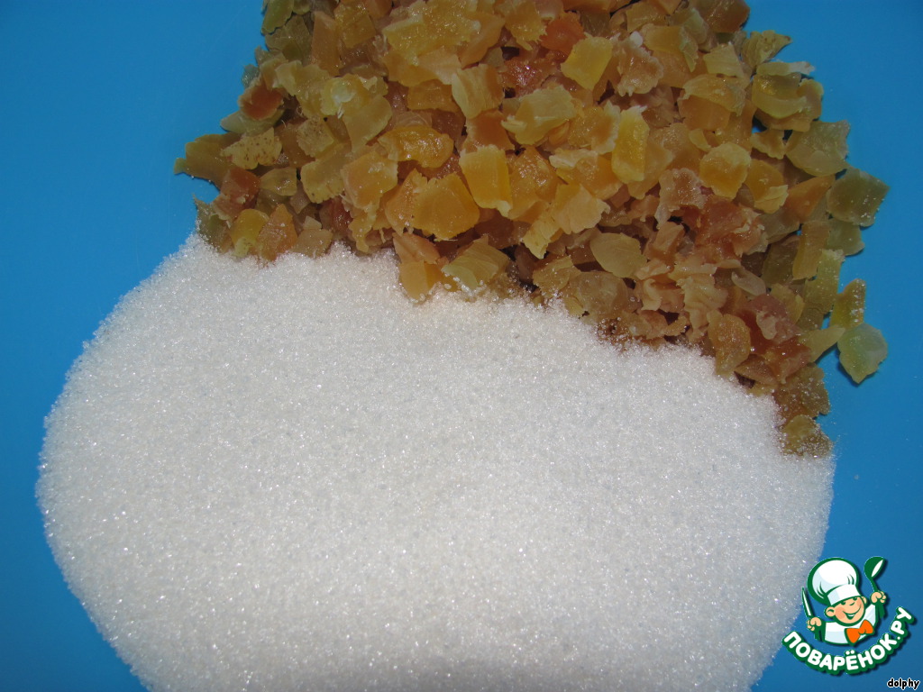 В большой миске соедините сахар, разрыхлитель теста и вяленые персики (или курагу).