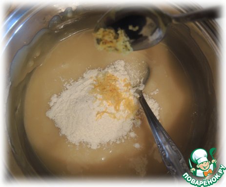 Соду смешиваем с 1 столовой ложкой муки и всыпаем в тесто. Добавляем цедру и оставшуюся муку.
