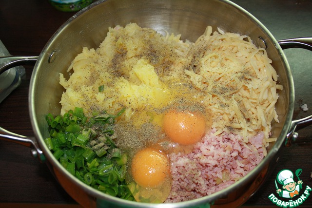 Добавить 3 яйца, мелко нарезанный зеленый и репчатый лук, 2 ложки муки. Посолить и поперчить.