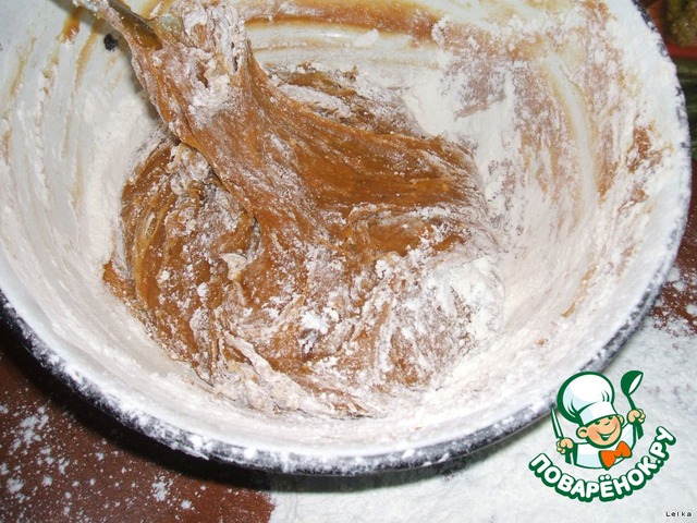1 яйцо взбить с 6 ст.л. сахара, добавить 2 ст.л. мёда, ч.л. соды, 50 г масла, 2,5 ст.л. молока.
