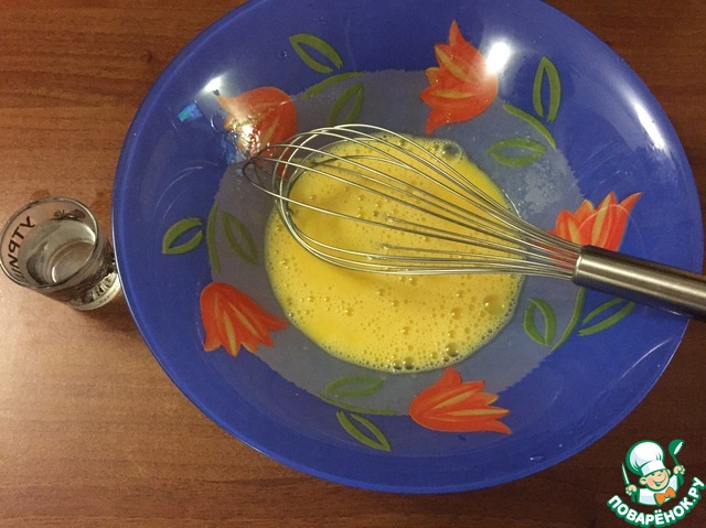 Взбить венчиком 2 яйца и 2 желтка+ щепотка соли, добавить водку