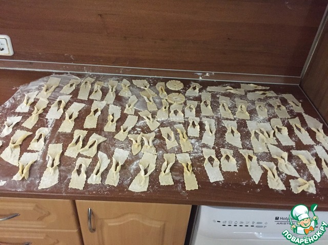 Раскатываем тесто на столе смазанном мукой в тонкий пласт 2 мм