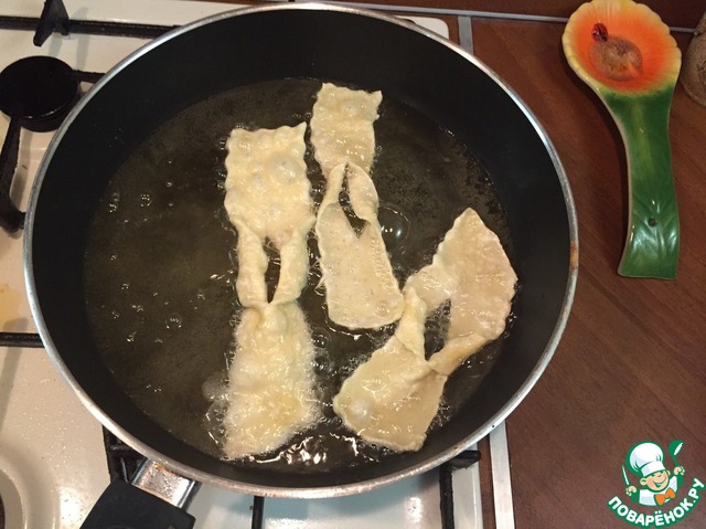 Разогреваем масло в сковороде ( где то на два пальца от дна сковороды), кладем хворост, обжариваем в течение 2-3 сек. с каждой стороны