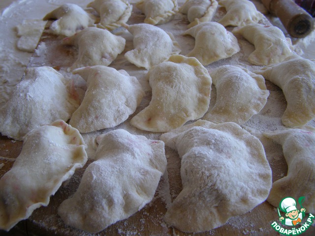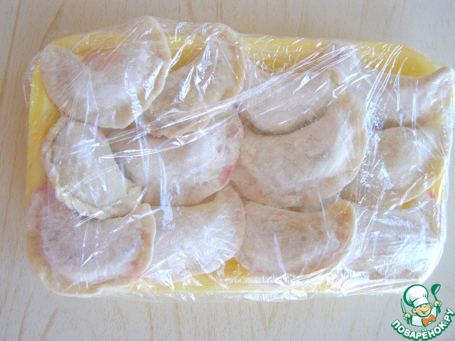 На разделочную доску, посыпанную мукой, чтобы не прилипли, выкладываем наши вареники стройными рядами. Замораживаем прямо на доске в морозилке.