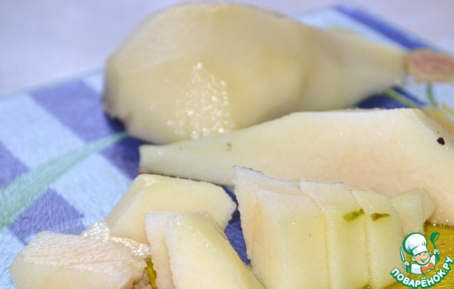 Грушу очистить от кожуры и сердцевины, порезать кубиками.