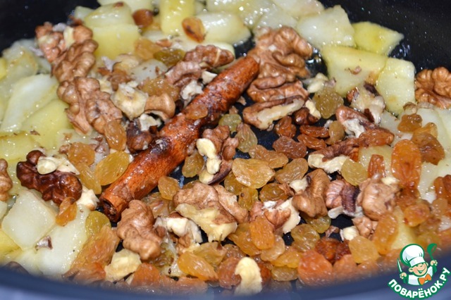 Добавляем палочку корицы, грецкие орехи и промытый изюм. Перемешиваем.