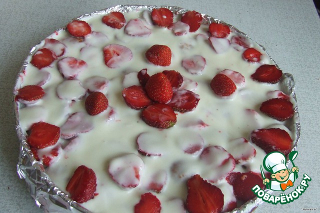 Заливаем сметанным крем, украшаем ягодами и ставим в холодильник примерно на 5 часов.