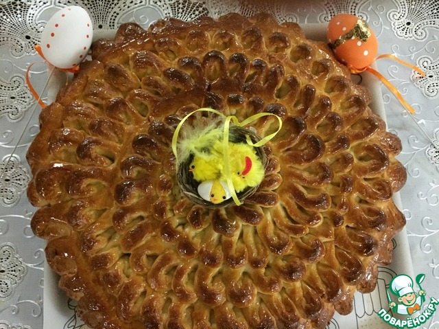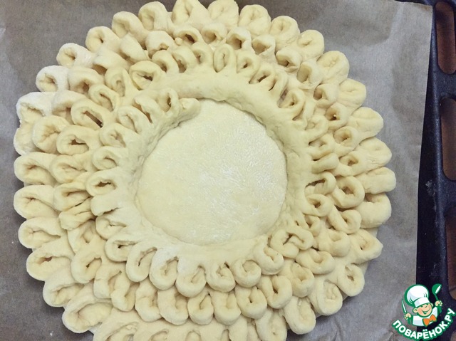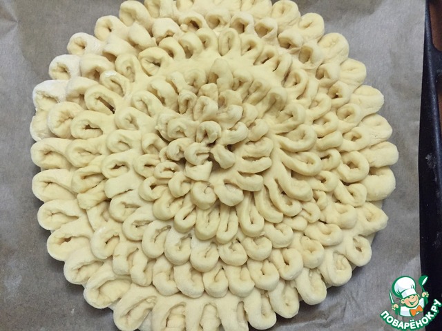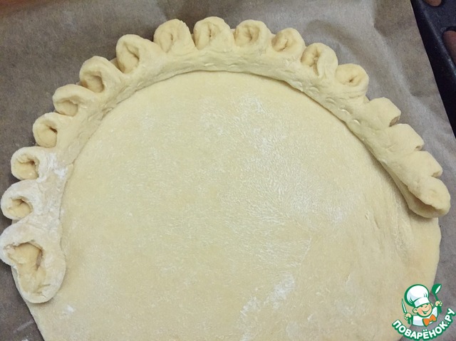 Полоску складываем пополам, прижимаем ненадрезанные края и укладываем по краю пирога, при этом расправляем кудри, как бы разворачивая, дырочкой кверху. Делаем несколько полосок, так как одной лентой не удобно