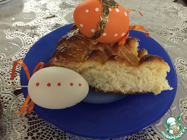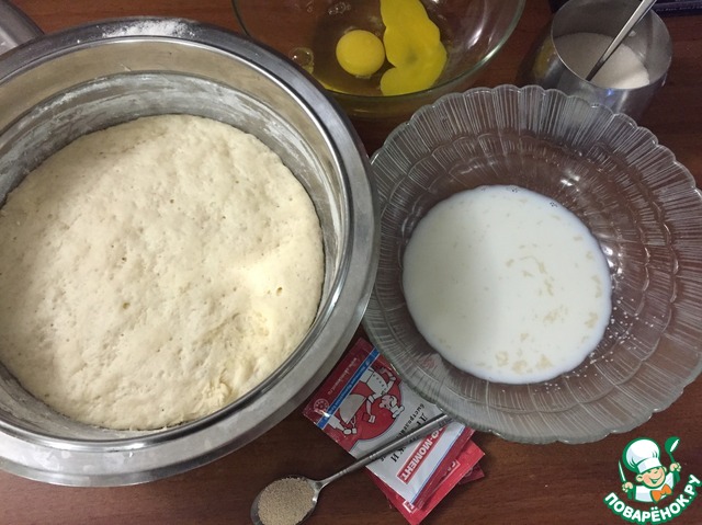 Готовим тесто: в теплом молоке растворить вторую порцию дрожжей, сахар, соль, добавить опару, слегка взбитые яйца, перемешать, добавляя порциями муку. Когда тесто будет еще липкое, но уже сформированное вмесить размягченный маргарин, домесить муку. Тесто должно быть эластичным, но не забитым, накрыть и убрать в теплое место на 2-2,5 часа