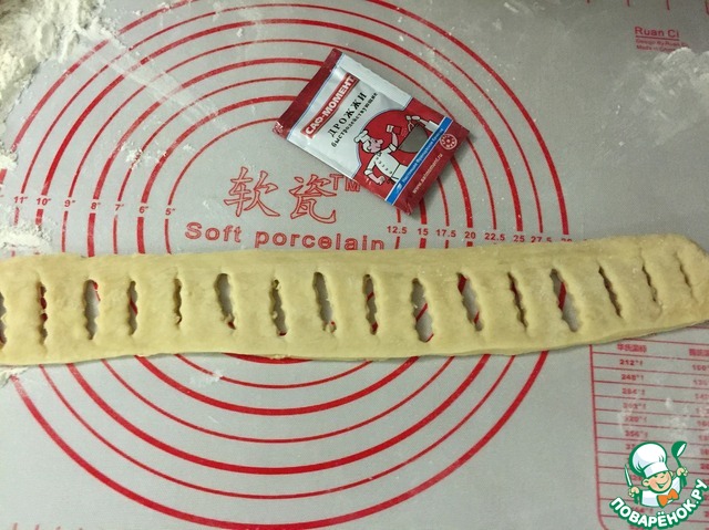 Обминаем тесто, делим на 2 части, одну раскатываем в круг, диаметром 25 см, укладываем на противень, смазанный маслом или застеленный пекарской бумагой. Из второй части делаем колбаски, раскатываем полоски, шириной 8 см, толщиной 3 мм, на полоске делаем надрезы, примерно через 1 см