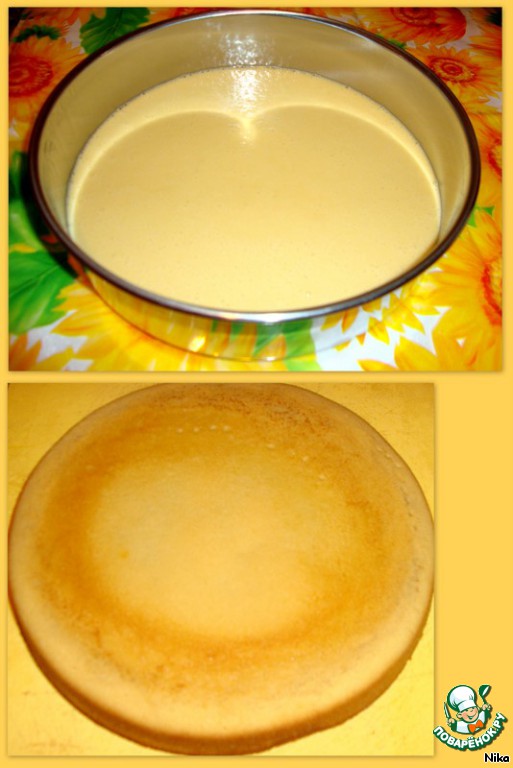 Форму смазать любым маслом и тесто для бисквита вылить в неё. Бисквит разрезать на два коржа. (Я не ждала когда он остынет...)