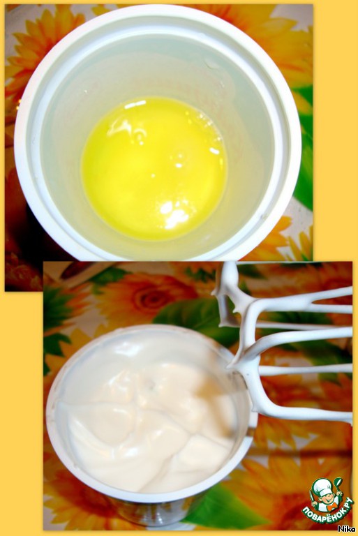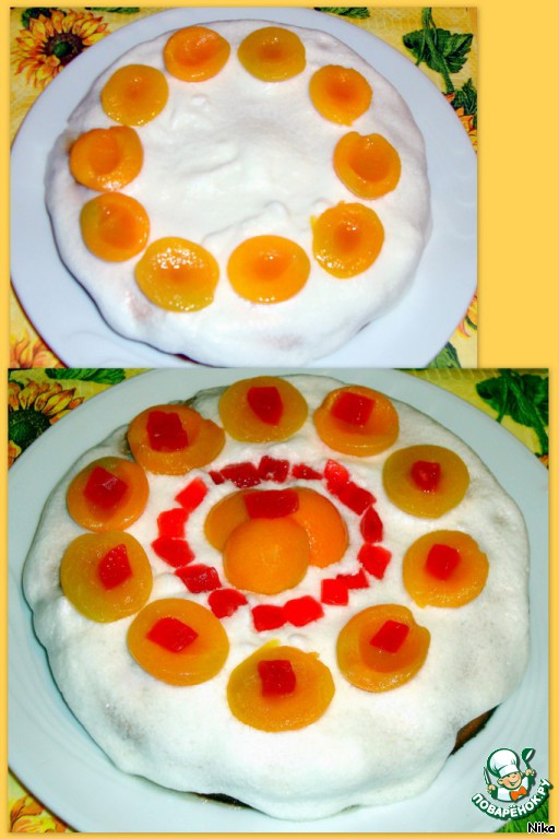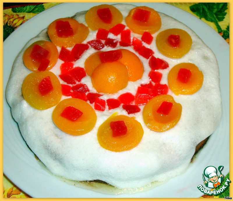 Верхний корж пропитать сиропом из компота и обмазать взбитым белком. Во время взбивания добавить ромовую эссенцию