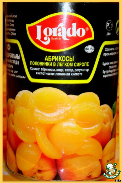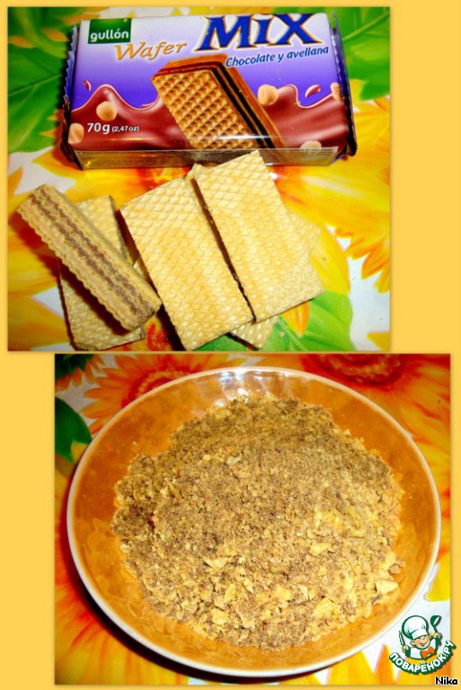 Этот тортик я сделала в этот же день, сразу после ухода подруги. Наши посиделки затянулись, не заметив как, но мы съели весь тортик. Мои взрослые "маленькие" сыновья возмутились, что я им не оставила даже попробовать...Я проделала всё тоже самое и с этим тортиком. Но на крем яиц не хватило. Верхний корж пропитала сиропом из компота. Обсыпала тёртыми шоколадными вафлями. Выложила в таком же порядке абрикосы и цукаты.