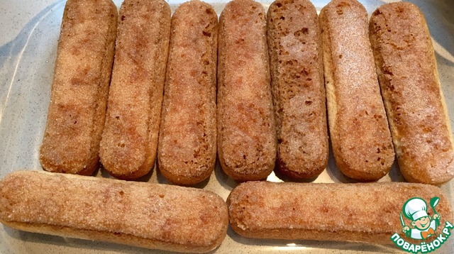 Возьмите форму. Быстро окунайте печенье ( сладкой стороной) в кофе буквально на 2 секунды, стряхивайте и выкладывайте на дно формы.