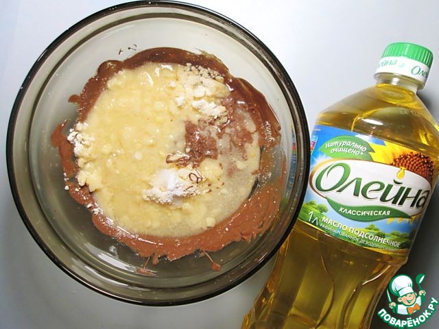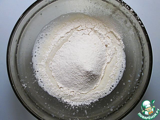 Добавляем к тесту просеянную муку с разрыхлителем теста и солью, перемешиваем венчиком.