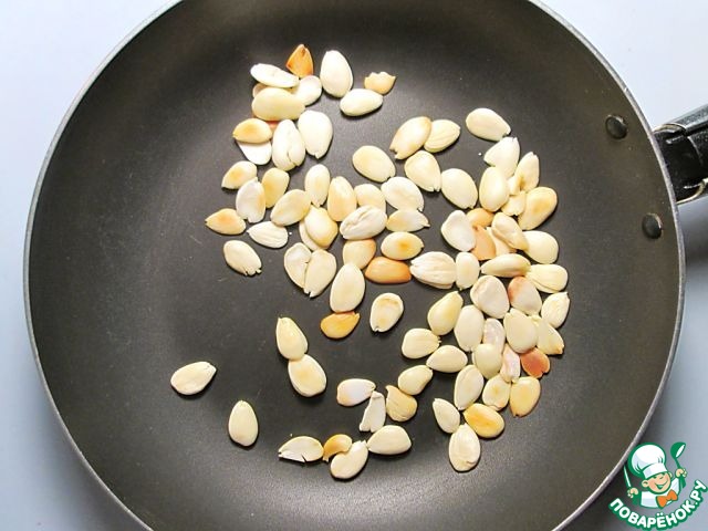 Орехи обжариваем несколько минут при непрерывном помешивании до золотистого цвета. Я использовала абрикосовые косточки. Размалываем орехи в кофемолке вместе с сахарной пудрой.