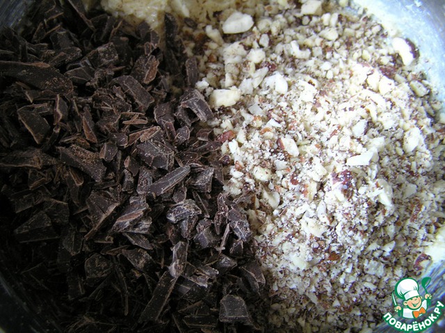 Добавить измельченные орехи и шоколадные чипсы (рубленный шоколад или стружку), перемешать.