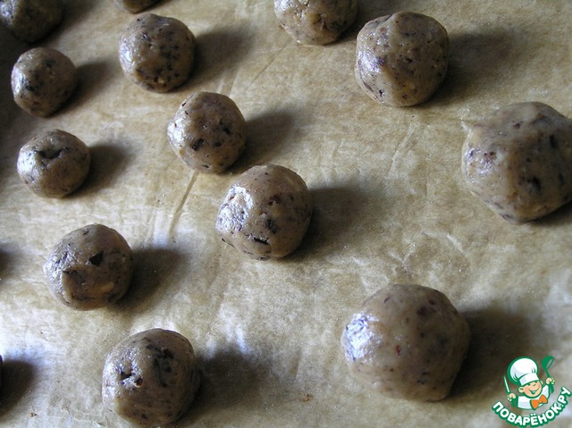 Из полученной массы скатать небольшие шарики, выложить на пергаментную бумагу на расстоянии друг от друга (в процессе выпечки шарики осядут и немного расплывутся).