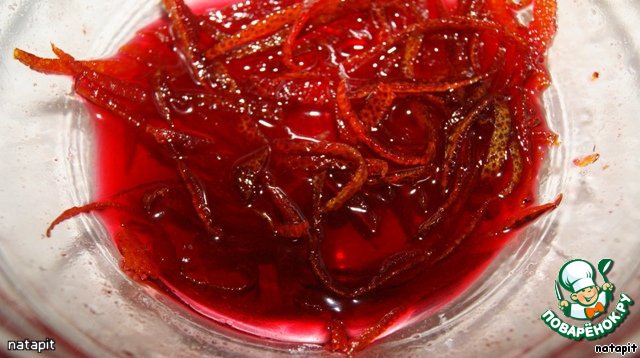 Цедру залить клубничным сиропом и проварить 2-3 мин. в микроволновой печи, охладить.
