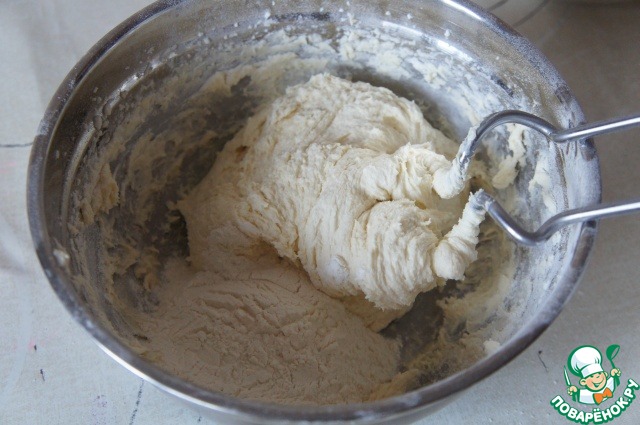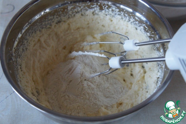 Продолжая взбивать, частями всыпать мучную смесь в масляную.