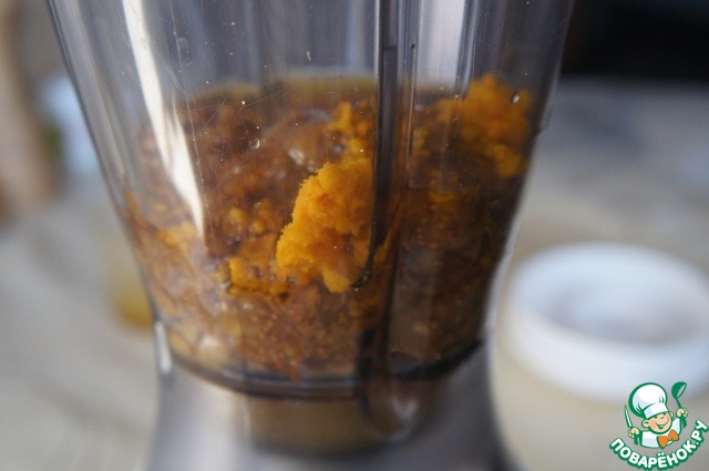 Ну, а теперь САМОЕ ТРУДНОЕ!!! Поместить инжир в блендер, добавить сок и цедру, влить мед (сначала не весь, немного оставить), измельчить в однородную массу. Сделать это довольно трудно, я намучилась страшно. Пришлось включать и выключать блендер много раз, он, зараза, крутиться не хочет, нагревается...