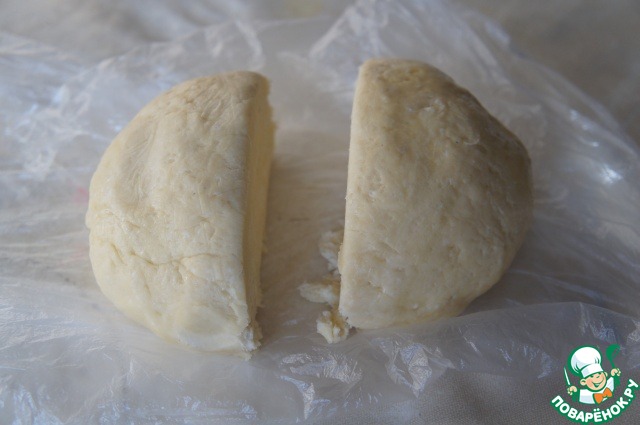 Тесто достать из холодильника, разделить на 2 части, одну убрать обратно.