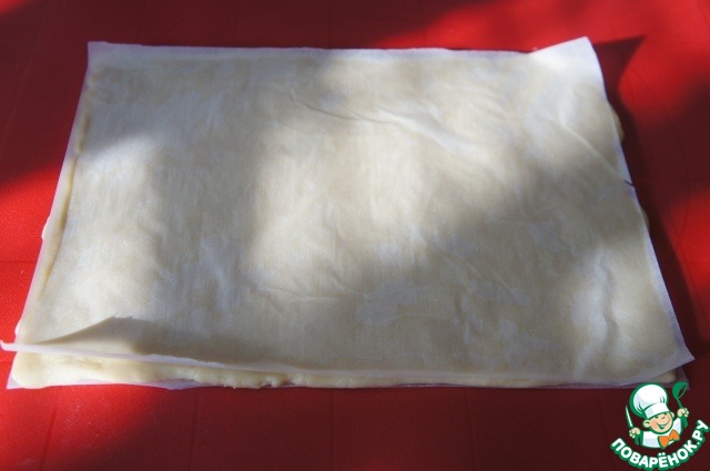 Первую часть раскатать между листами пергаментной бумаги в тонкий прямоугольник.