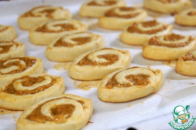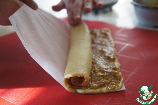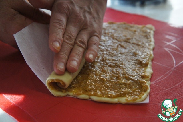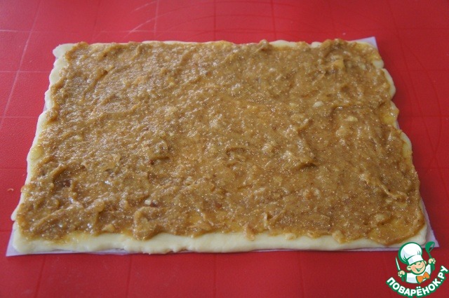 Снять верхний лист пергамента, распределить по тесту половину начинки, оставив с одного длинного края примерно 1 см теста без начинки.