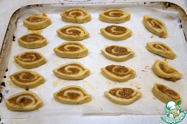 Затем вынуть рулеты (по одному), слегка сплющить их и нарезать кусочками толщиной 1 см. Уложить кусочки плашмя на противень, застеленный бумагой, кончики слегка заострить и вытянуть, чтобы печенье по виду напоминало листики.
