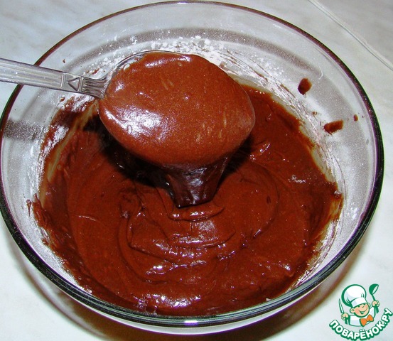 Добавляем просеянную муку с какао-порошком и разрыхлителем. Хорошо перемешиваем и получаем тесто вот такой вот консистенции.