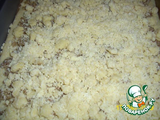 Посыпать поверх начинки, дать пирогу постоять перед выпечкой минут 40.