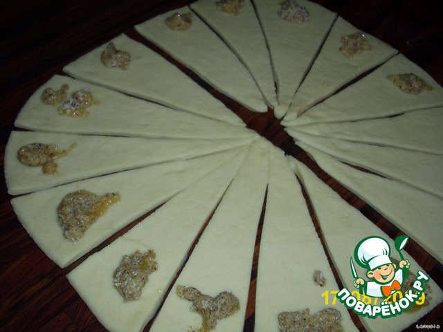 Из оставшегося теста раскатать тонкий пласт и, разделив на треугольники, выложить начинку.