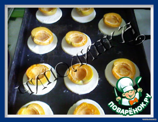 Противень смочить водой, выложить готовые кружочки, наколоть вилкой, смазать желтком. На каждый кружочек выложить половинки абрикос. Насыпать немножко сахара.