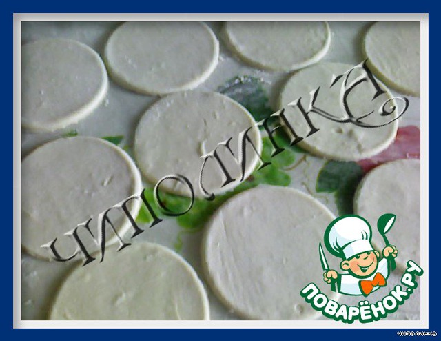 Тесто разморозить, раскатать в пласт, на присыпанном мукой столе, вырезать стаканом 10 кружочков.