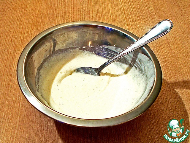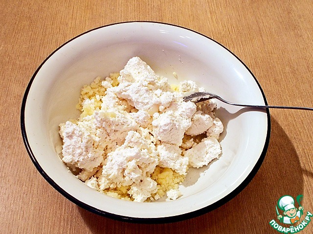 Растираем сливочное масло с сахаром. Добавляем ванильный сахар и разрыхлитель. Растираем. Добавляем творог, перемешиваем. Добавляем по одному яйца, продолжая мешать. Наконец, добавляем набухшую манку. Хорошо взбиваем.