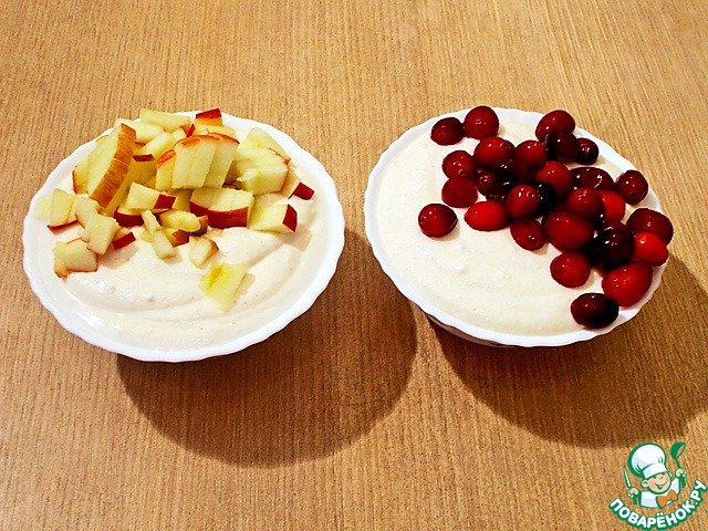 Раскладываем творог по двум мискам. Добавляем в одну из них клюкву, в другую - яблоки. Размешиваем.