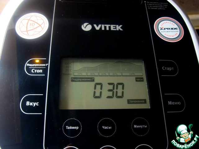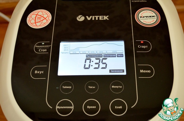 Установить режим «Запеканка», затем кнопочками «Время», «Часы» и «Минуты» выставить время приготовления 35 минут. Во время приготовления запеканки, крышку мультиварки не открывать!!!
