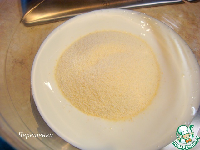 Кефир перемешать с манкой, солью, ванилином и содой и дать набухнуть манке, а соде начать работать 20 минут.