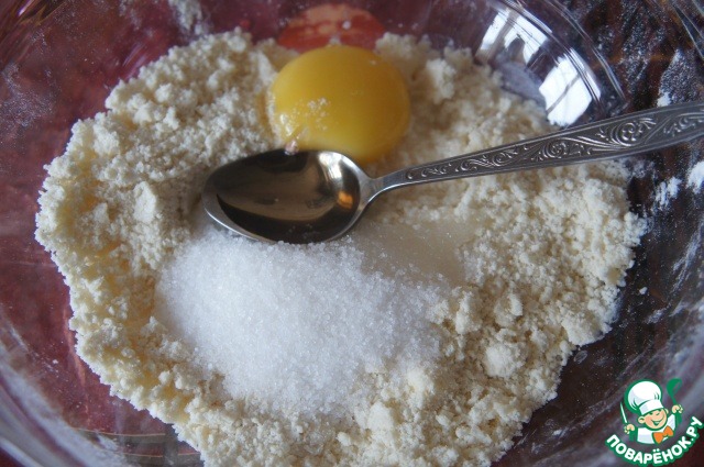 Итак, просеять в миску муку, сделать углубление и положить в него нарезанное маленькими кубиками холодное масло. Быстро порубить все ножом в однородную крошку (можно перетереть руками, но в любом случае надо делать это быстро, чтобы тесто не согрелось). Добавить сахар, желток, щепотку соли, уксус и ледяную воду.