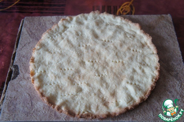 Форму d 20 см смазать и выстелить пергаментом. Тесто немного раскатать и выложить на дно, разровнять. Многократно наколоть тесто вилкой и выпечь в течение 15 мин. при температуре 200*С. Корж осторожно вынуть, снять пергамент и остудить.